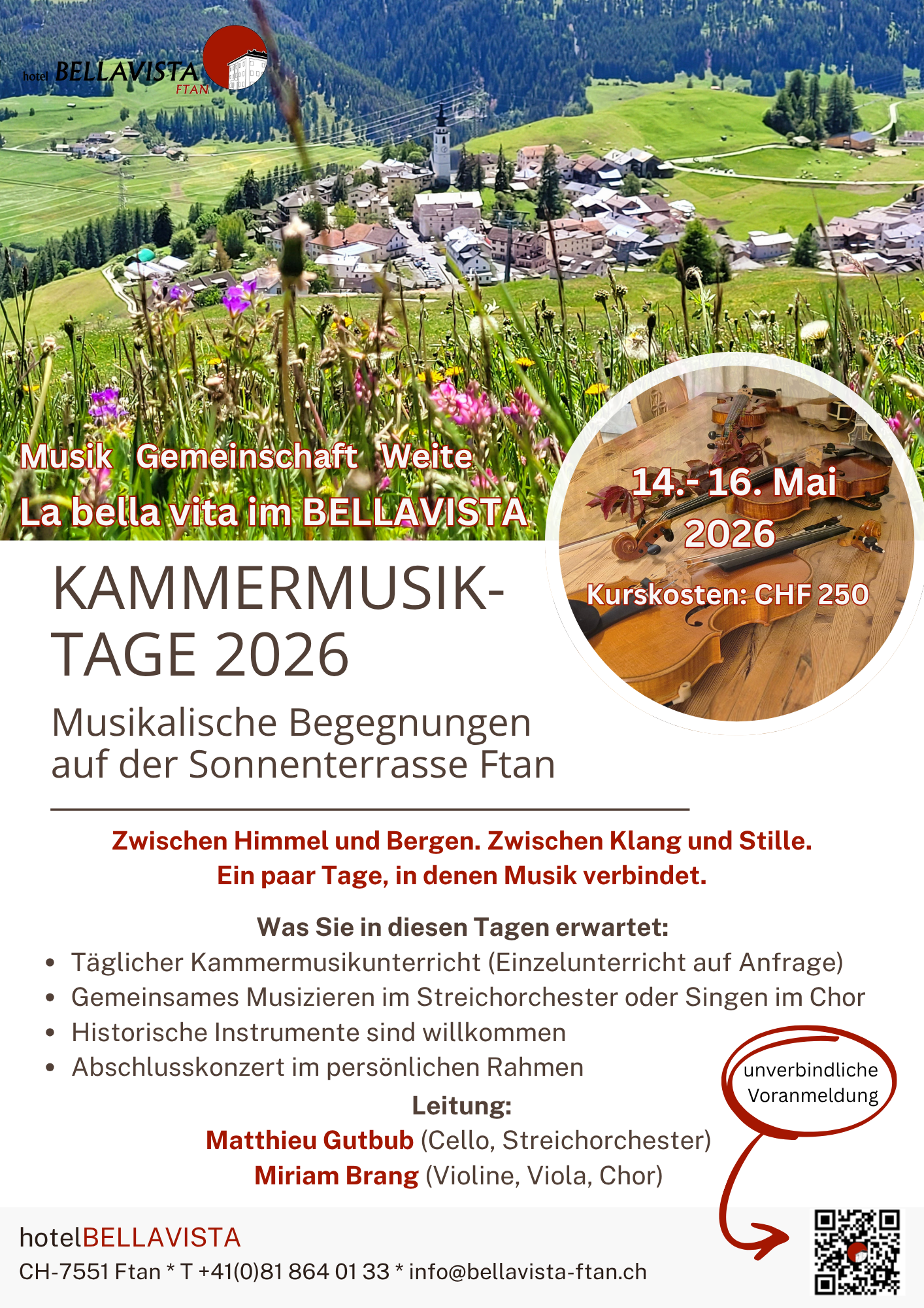 Die Kammermusiktage in Ftan richten sich an engagierte Amateurinnen und fortgeschrittene Musikerinnen, die Freude am gemeinsamen Musizieren haben und ihre kammermusikalischen Fähigkeiten vertiefen möchten. In der inspirierenden Umgebung der Sonnenterrasse des Unterengadins verbindet der Kurs musikalische Arbeit mit Austausch, Konzentration und Naturerlebnis.