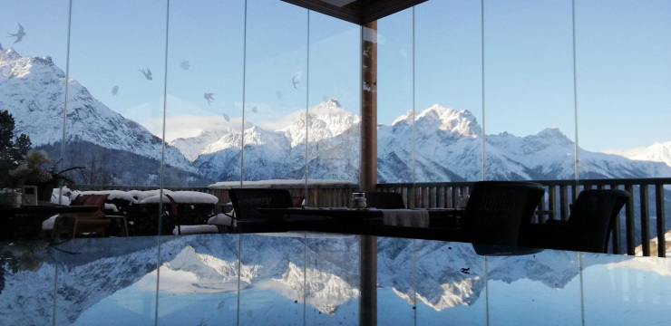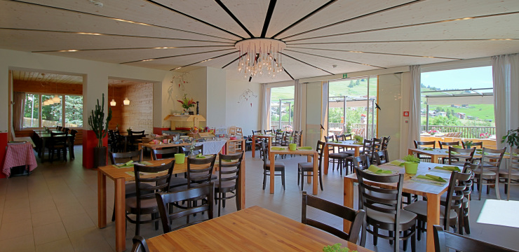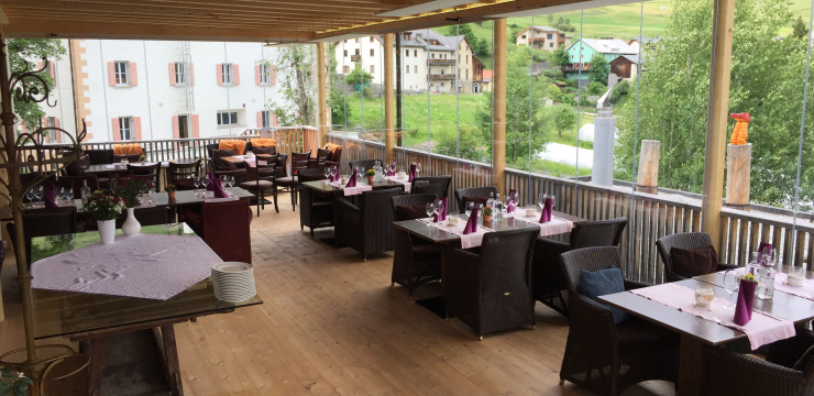 Unser Restaurant bietet Platz für bis zu 60 Personen und verfügt über eine Arvenstube, die bis zu 25 Personen Platz bietet, sowie ein Sitzungszimmer für bis zu 16 Personen. Die komplett verglaste Veranda im Osten ist 90m² groß und bietet eine fantastische Aussicht sowie eine gemütliche Atmosphäre zum Essen und Entspannen.