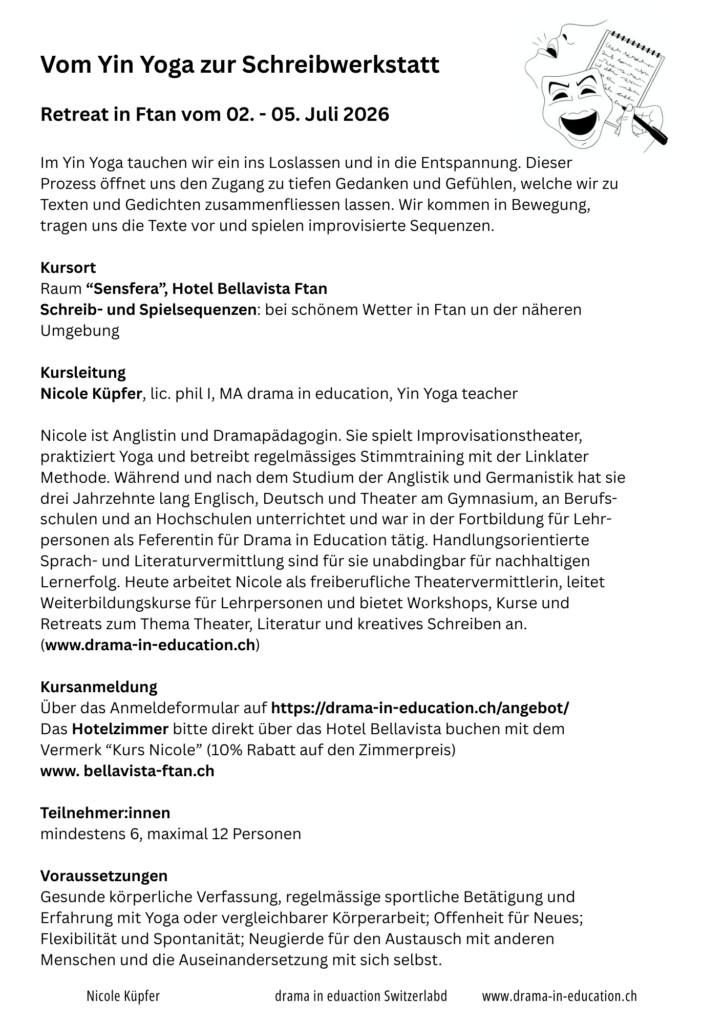 Wir freuen uns, dass Nicole Küpfer ihr Retreat „Vom Yin Yoga zur Schreibwerkstatt“ bei uns anbietet. Eine Einladung, über Ruhe, Bewegung und Worte neue Ausdrucksformen zu entdecken.